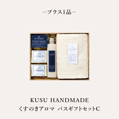 【プラス一品】さわやかな楠の香り溢れるフェイスタオル(くすのきフェイスタオル)、ソープ(くすのきピュアリソープ)、バスソルトの3点セットです。